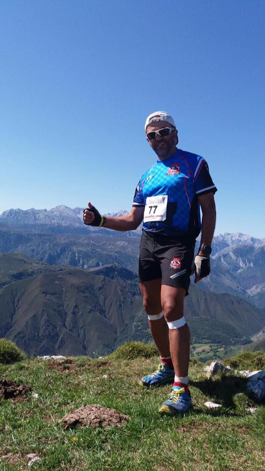 Europa. Es un sendero mas agradable de subir que el que acabamos de hacer, senda estrecha pero fácil, donde se trata de apoyar las manos en las rodillas e ir comiendo metros de desnivel, con unas vistas preciosas y donde mejor no mirar hacia arriba si no quieres desmoralizarte, aquí y tras tomar coca-cola en el avituallamiento y un gel de Overstims, voy subiendo chino-chano a muy buen ritmo, las piernas responden de maravilla y a pesar de saber que voy de los últimos me da igual, bastante agradezco que conforme tengo otra vez las rodillas pueda estar saboreando estas montañas tan verdes y de fondo los Picos de europa, así hasta que llego al collado y gran fotógrafo Luis Lastra, deja constancia de mi buen humor a pesar del desnivel acumulado ya en las piernas.